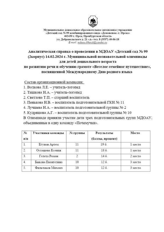 Олимпиада проходила в Муниципальном дошкольном общеобразовательном автономном учреждении № 65, расположенного по адресу: г.Орск, пр.Металлургов, 13А.В состав организационной комиссии входило 3 педагога:1. Наумова Оксана Игоревна (Старший воспитатель)2. Гранковская Татьяна Николаевна (воспитатель)3. Голенкова Юлия Викторовна (воспитатель)В олимпиаде принимала участие 1 команда «Букваренок», дети подготовительной группы, в количестве 5 человек:1. Анохин Лев2. Перепелица Ульяна3. Мотякина Теона4. Михайлова Евгения5. Яковенко АртемВсего в олимпиаде приняли участие: 3 педагога, 5 воспитанников.Результаты команды: 83 балла. 2 ребенка набрали -18 баллов2 ребенка -16 баллов1 ребенок -15 балловДети справились с поставленными задачами олимпиады, выполнив все задания.