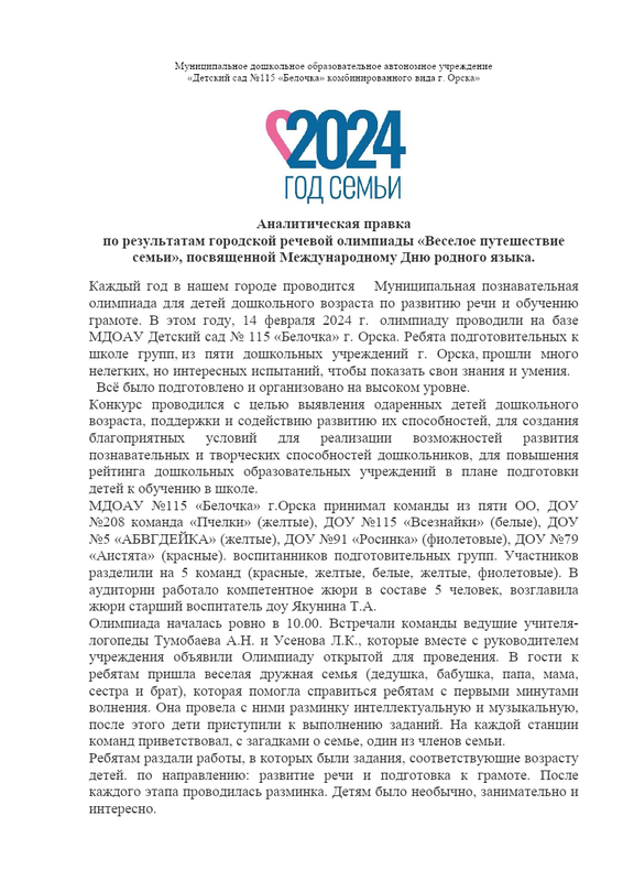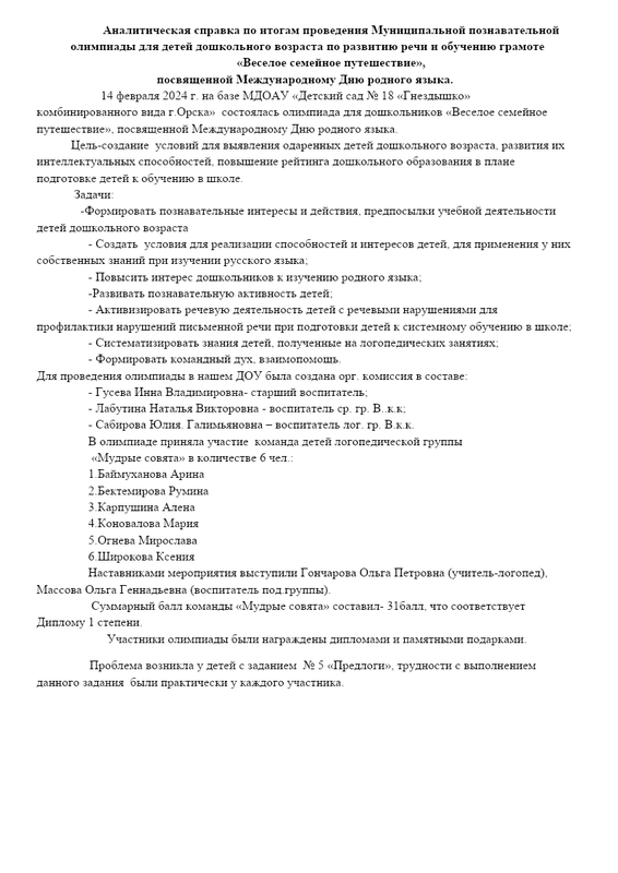 Аналитическая справка о проведении олимпиады для детей дошкольного возраста по развитию речи и обучению грамоте, посвященной Международному дню родного языка в МДОАУ №65.
